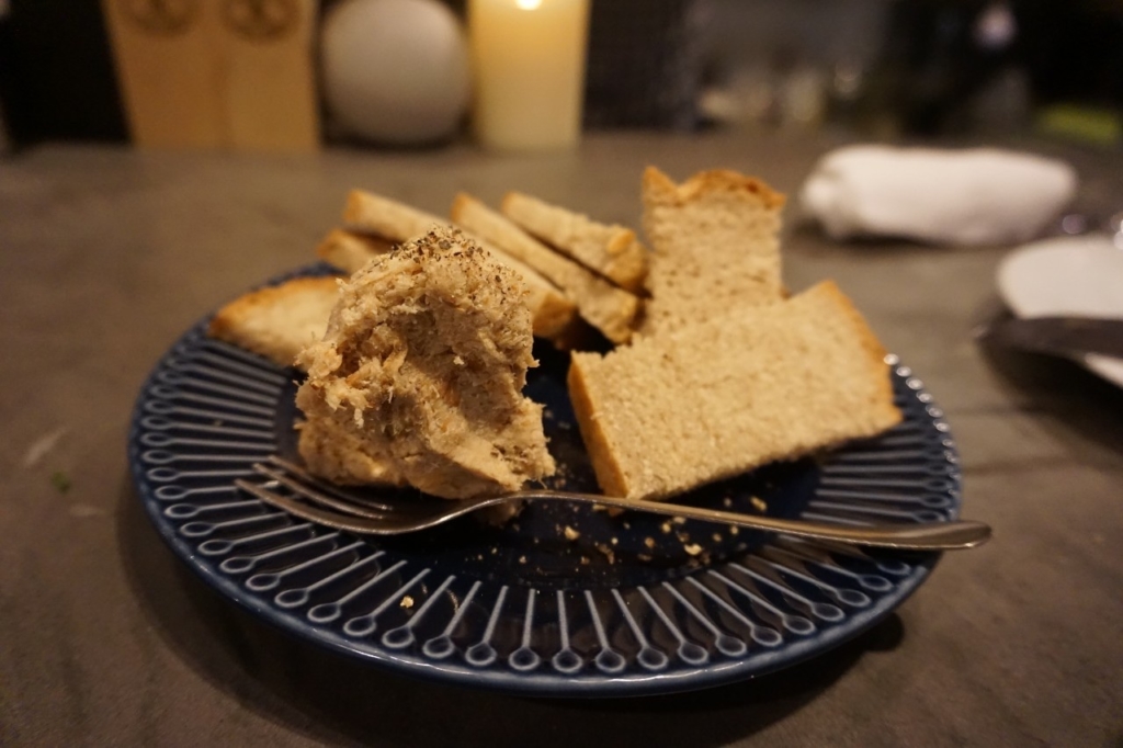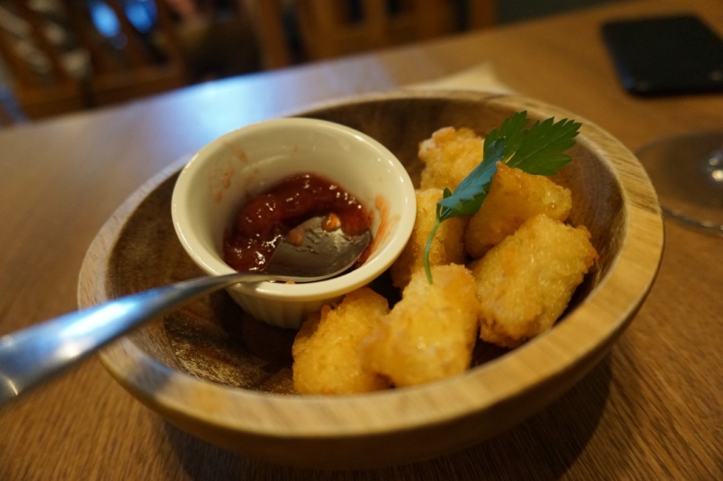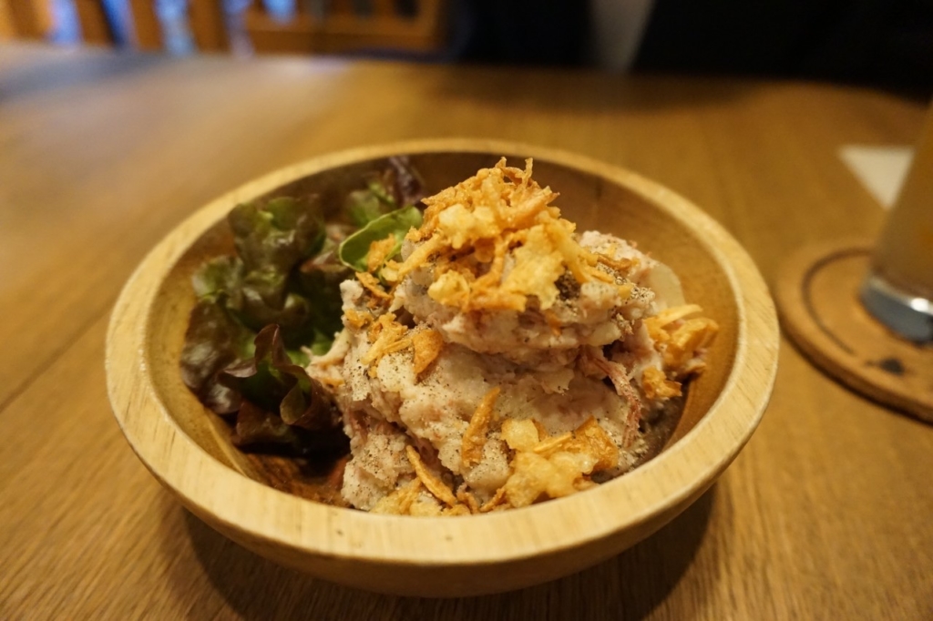 ニンニクチップの乗ったポテトサラダに、カマンベールチーズのフリット?がビールやワインにぴったり。